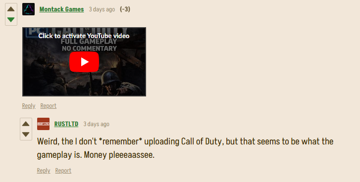 About that. Literally anyone here can can view your recent posts on itch by clicking your name on any of your posts. And report them from that summary. By the way whats with promoing a Call of Duty long play on itch.io?